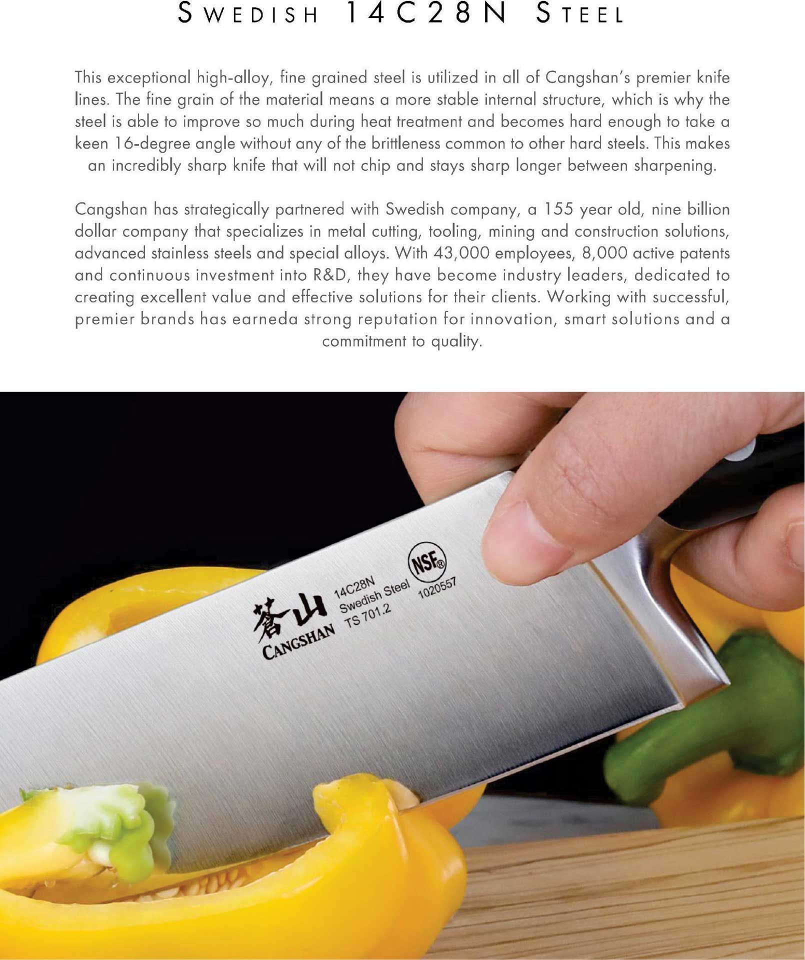 This exceptional high-alloy, fine-grained steel is utilized in all of Cangshan's premier knife lines. The fine grain of the material means a more stable internal structure, which is why the steel is able to improve so much during heat treatment and becomes hard enough to take a keen 16-degree angle without any of the brittleness common to other hard steels. This makes an incredibly sharp knife that will not chip and stays sharp longer between sharpening.