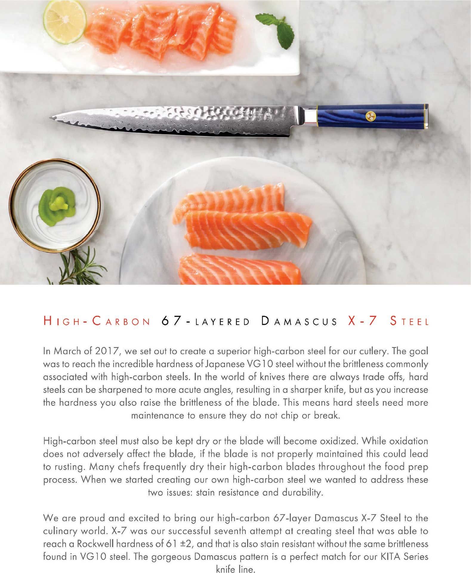 Aesthetics must push into function. Every curve and angle is used to ensure a secure and comfortable hold on the handle, making the knife become a natural extension of one's arm. Our knives are exceptionally well balanced and every seam is flush. This means our knives feel great to grip and hold, work well for heavy kitchen use, and are easy to keep clean and sanitary. These knives provide razor sharpness, robust durability, and incredible comfort to the user.